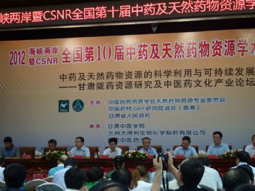 2012年8月14日—18日,由中國自然資源學會天然藥物資源專業委員會、中國藥材GAP研究促進會(香港)、甘肅省人民政府聯合主辦,甘肅中醫學院、蘭州大得利生物化學制藥(廠)有限公司、南京中醫藥大學聯合承辦的“2012海峽兩岸暨CSNR全國第十屆中藥及天然藥物資源學術研討會”于在甘肅蘭州隆重召開。天津中醫藥大學校長、中國工程院院士張伯禮、中國中藥協會副會長吳憲、中國藥材GAP研究促進會會長周榮漢教授、CSNR天然藥物資源專業委員會主任委員段金廒教授等來自全國31個省、市、自治區以及港澳臺等地區400多名代表參會。