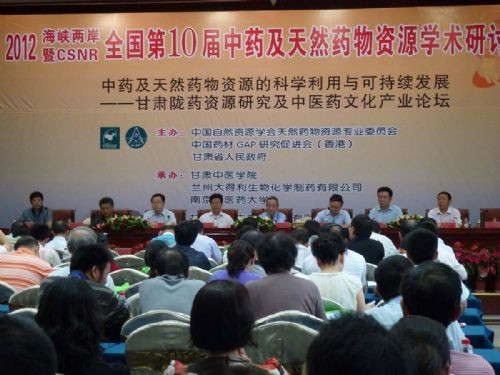 2012年8月14日—18日,由中國自然資源學會天然藥物資源專業委員會、中國藥材GAP研究促進會(香港)、甘肅省人民政府聯合主辦,甘肅中醫學院、蘭州大得利生物化學制藥(廠)有限公司、南京中醫藥大學聯合承辦的“2012海峽兩岸暨CSNR全國第十屆中藥及天然藥物資源學術研討會”于在甘肅蘭州隆重召開。天津中醫藥大學校長、中國工程院院士張伯禮、中國中藥協會副會長吳憲、中國藥材GAP研究促進會會長周榮漢教授、CSNR天然藥物資源專業委員會主任委員段金廒教授等來自全國31個省、市、自治區以及港澳臺等地區400多名代表參會。
