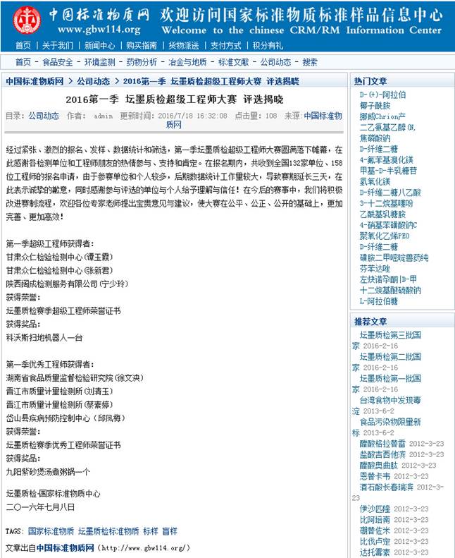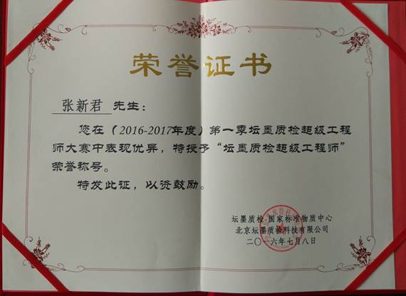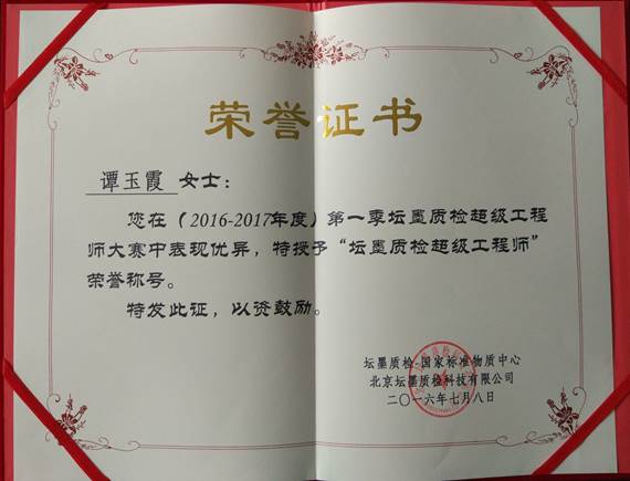 2016年7月,由壇墨質檢-國家標準物質中心舉辦的第一季超級工程師大賽,共有全國132家單位、158位工程師報名參加,最終評選出超級工程師3名、優秀工程師4名,其中甘肅眾仁檢驗檢測中心的譚玉霞、張新君表現優異,被授予“壇墨質檢超級工程師”榮譽稱號。